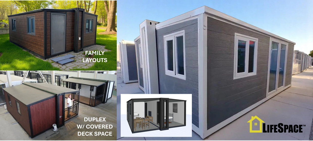 At LifeSpace™ we offer DuPlex, FourPlex and FamilyPlex Models as versatile, high-quality emergency, transitional and First Step housing solutions designed to balance privacy, durability, and community need. The FourPlex features four self-contained, secure rooms each with its own keypad lock entrance, temperature controls, and ample power access—ideal for individuals or small households requiring dignified, private shelter. The FamilyPlex variant retains the same rugged steel frame, steel insulated panels, and low-maintenance flooring systems but is laid out to better accommodate families, with additional internal layout flexibility to support parents with children. All models are constructed to meet rigorous habitability standards—fire, pest, weather, and maintenance resistance are built in from the ground up—while enabling rapid deployment. Whether deployed temporarily or permanently, these shelters offer safe, clean, efficient housing that communities can count on through crisis, transition or first step.